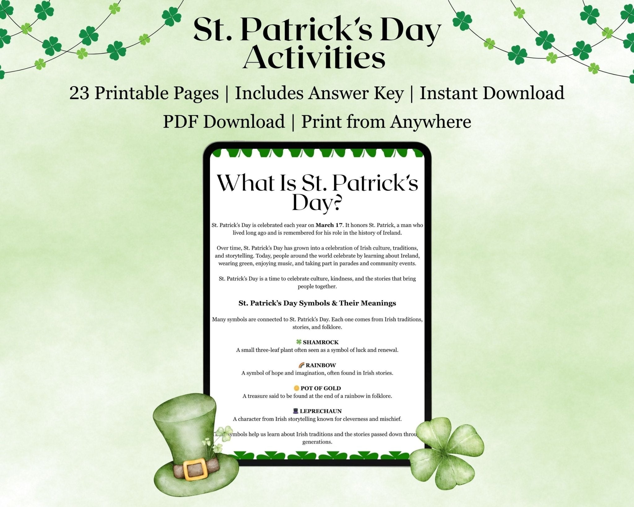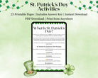 This instant-download printable PDF includes 23 total pages, featuring 20 fun activity sheets plus 3 answer sheets filled with coloring activities, word games, riddles, trivia, and creative prompts inspired by Irish traditions and symbols of luck. It’s a screen-free way to celebrate the holiday while encouraging learning and imagination.